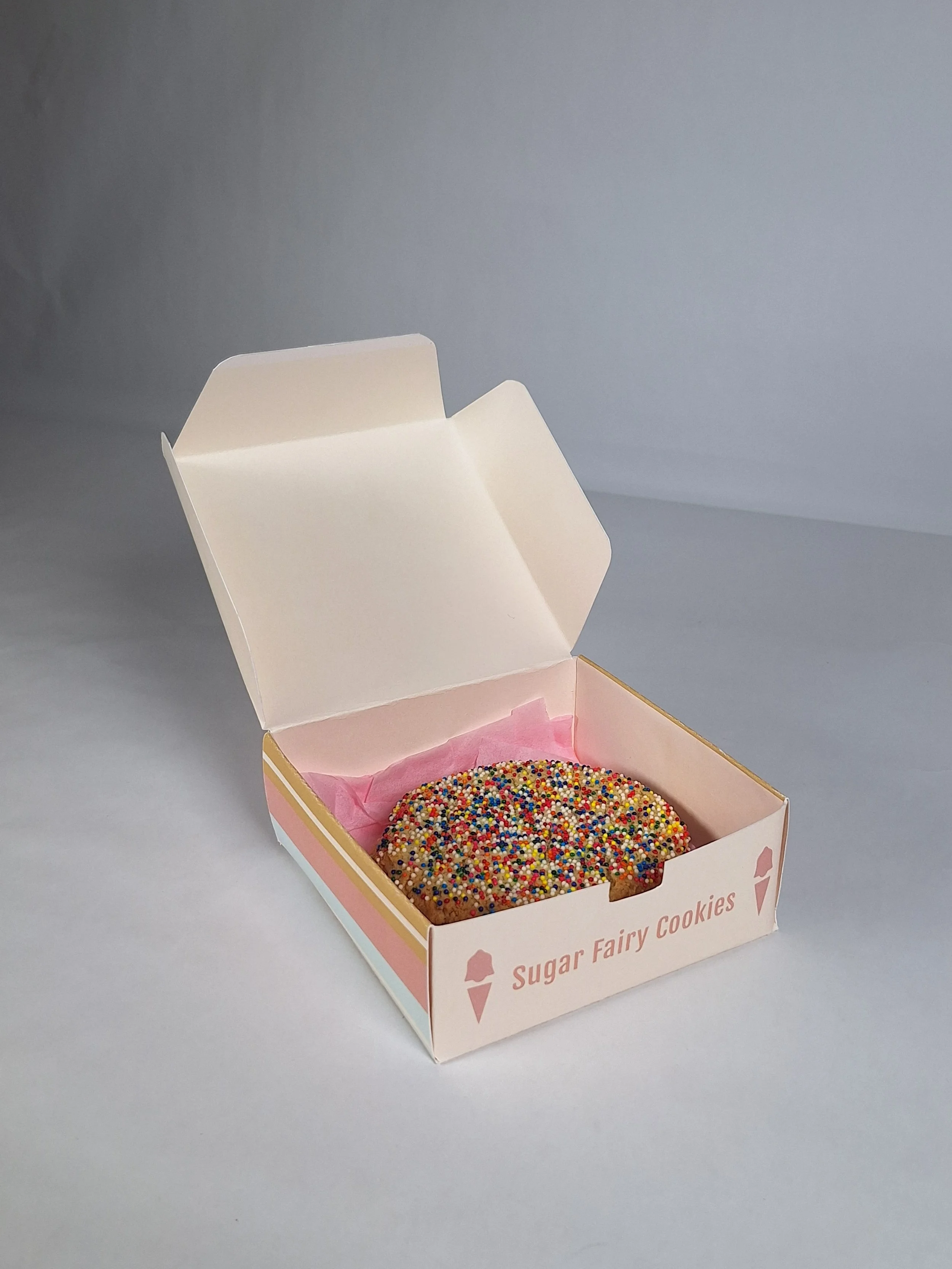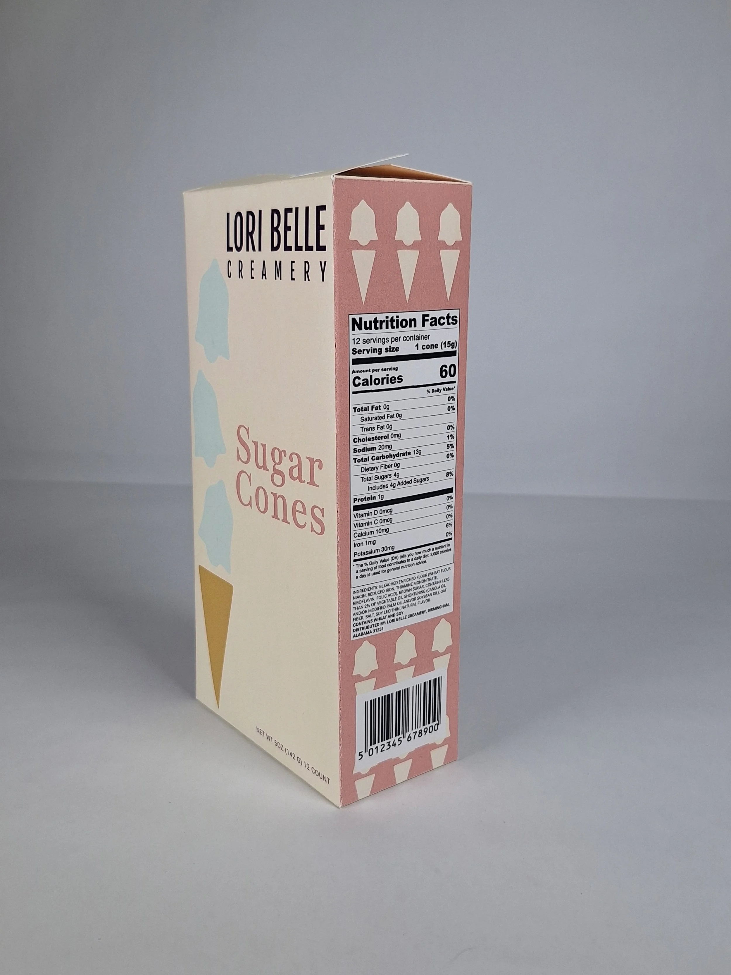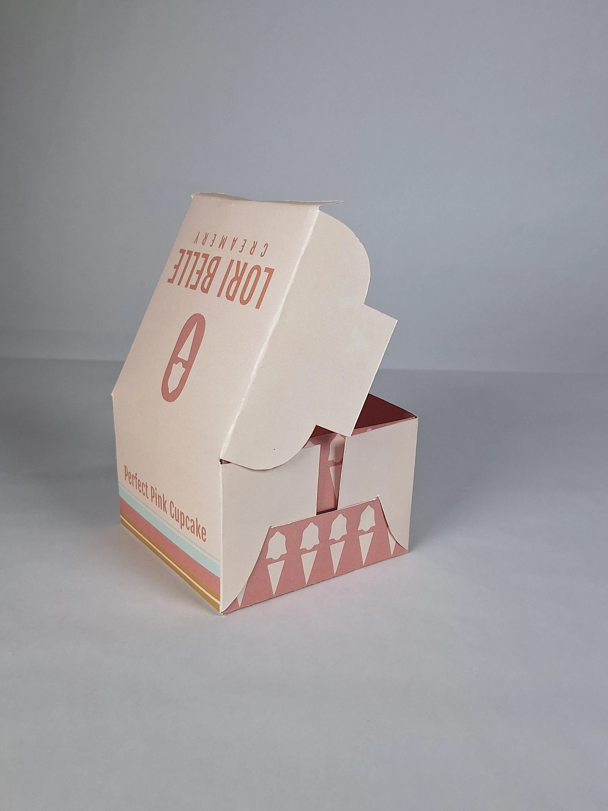 The packaging is from the same brand I created called Lori Belle Creamery. The company would sell cupcakes, cookies, and sugar cones. I used the same branding for the designs. I also created and constructed the packaging.